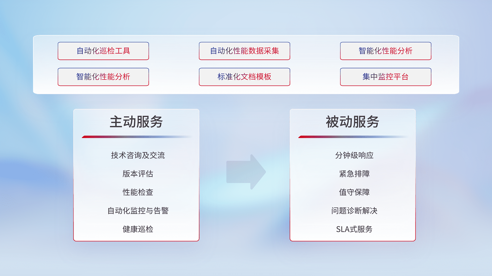 智能化工具和标准化文档,,,保障服务质量,,提供主动服务(包含技术咨询、、、版本评估、、、、性能检查、、、、自动化监控与告警、、、健康巡检)和被动服务包含(分钟级响应、、、紧急排障、、、值守保障、、、问题诊断解决、、SLA服务)。。。。
